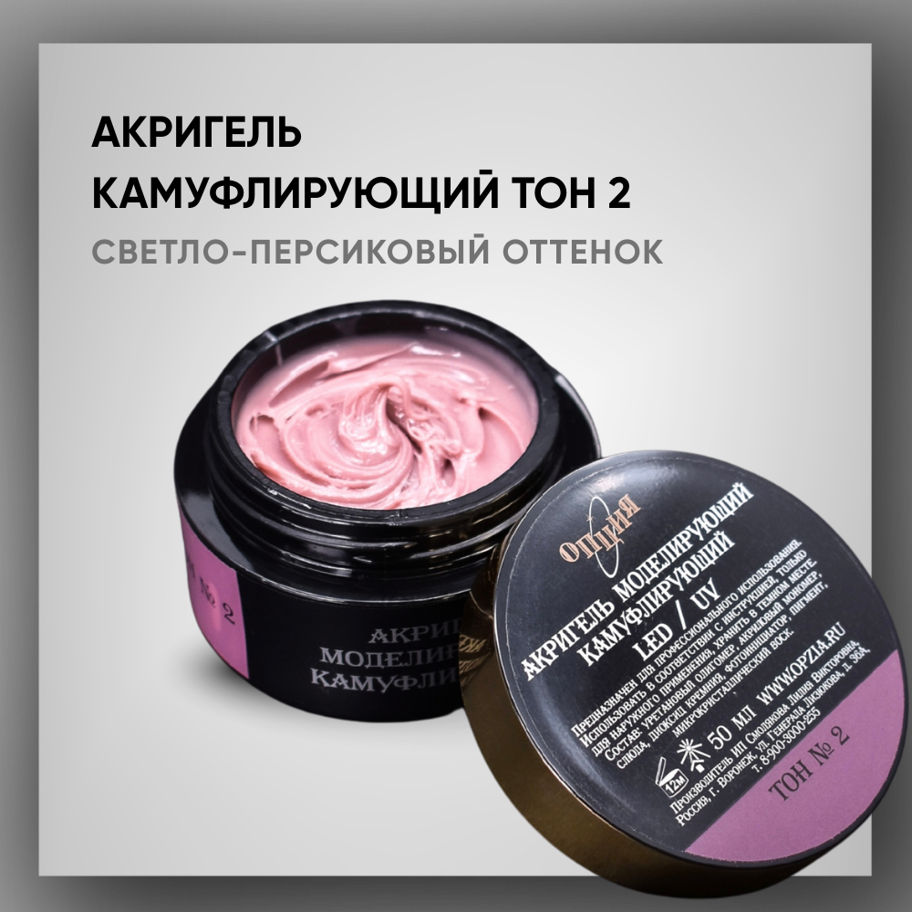Камуфлирующий акригель ТМ «Опция» Тон 2 — это гибрид геля и акрила в нежном светло-персиковом оттенке, предназначенный для укрепления и моделирования натуральных ногтей с эффектом естественного камуфляжа.