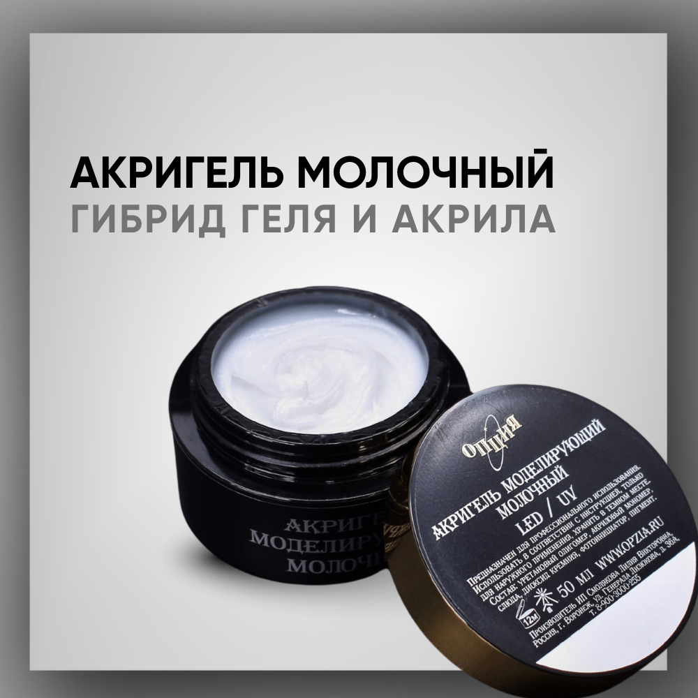 Акригель молочный - альтернатива гелевой системе, гибрид геля и акрила. Такой же комфортный в работе, как и гель, при этом не растекается, отлично слушается кисть, смоченную в обезжиривателе. Не сильно зернист и совершенно не пахнет. Кроме вышеперечисленного, мастера любят его за отсутствие жжения при полимеризации. Необходимо наносить на базовое покрытие.