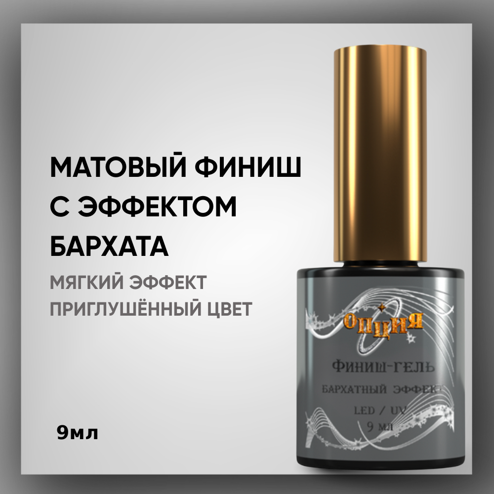 Финиш гель "Бархатный эффект" "Опция". Придает цветному покрытию матово-бархатный эффект. Не имеет липкого слоя. Универсален, подходит для всех систем. Не подходит аллергикам!