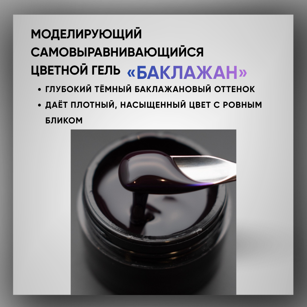 Гель ТМ Опция «Баклажан» — это насыщенный тёмно-фиолетовый оттенок с мягкой прозрачностью и чистой холодной цветностью.