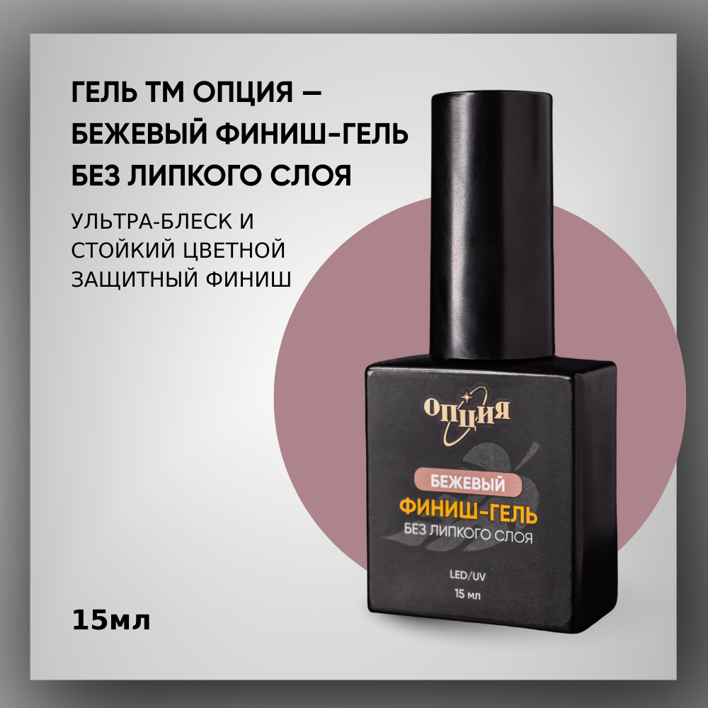 Бежевый финиш-гель без липкого слоя ТМ «Опция» — это завершающее покрытие с мягким натуральным оттенком и ультра-блеском.